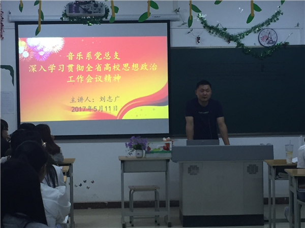 5月11日,音乐系党总支在小粉楼301教室召开以“深入学习贯彻全省高校思想政治工作会议精神”为主题的会议,学前教育专业全体学生参加会议,党总支副书记刘志广,宣传委员陈珂出席了本次会议。