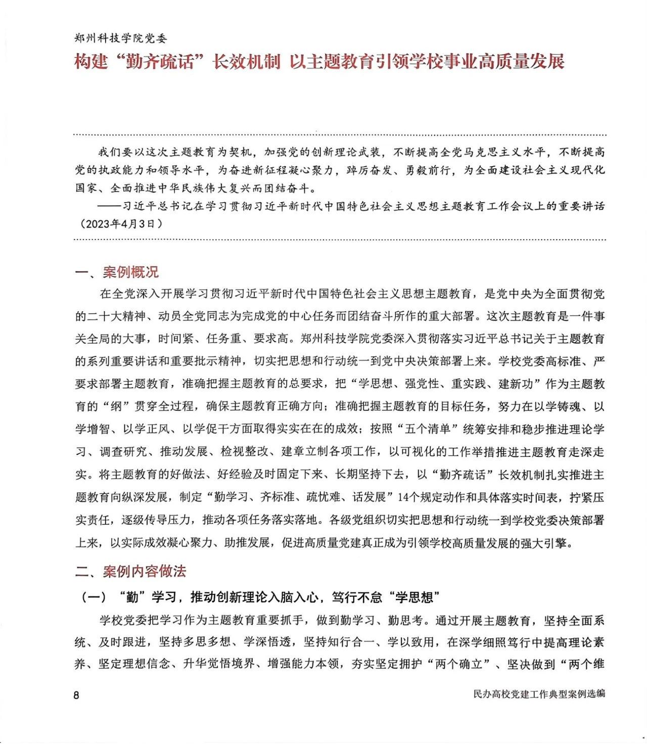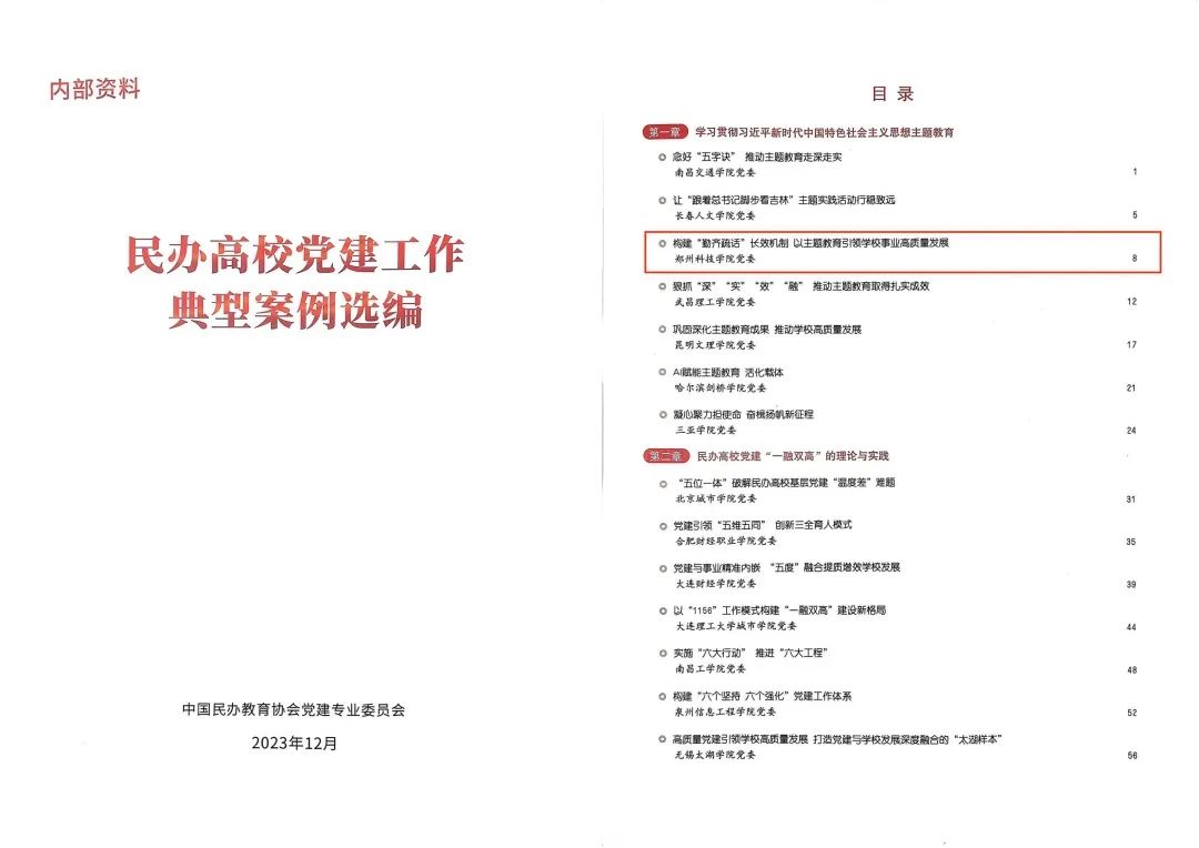 近日,中国民办教育协会党建专业委员会汇集编印了《民办高校党建工作典型案例选编》,我校党委撰写的《构建“勤齐疏话”长效机制以主题教育引领学校事业高质量发展》党建工作案例成功入选。《民办高校党建工作典型案例选编》由教育部思政司指导、党建专委会编辑。2023年12月18至19日在江苏南京召开的民办高校党建工作推进会上作为会议材料下发并受到中组部、教育部领导的高度肯定和认可。