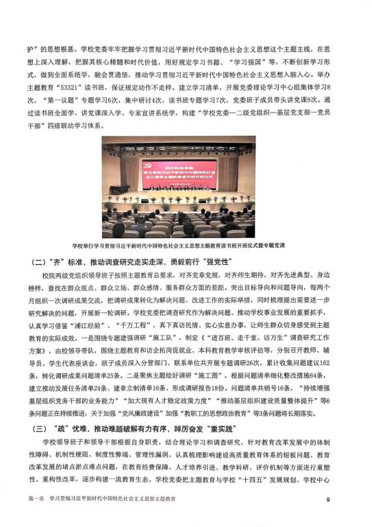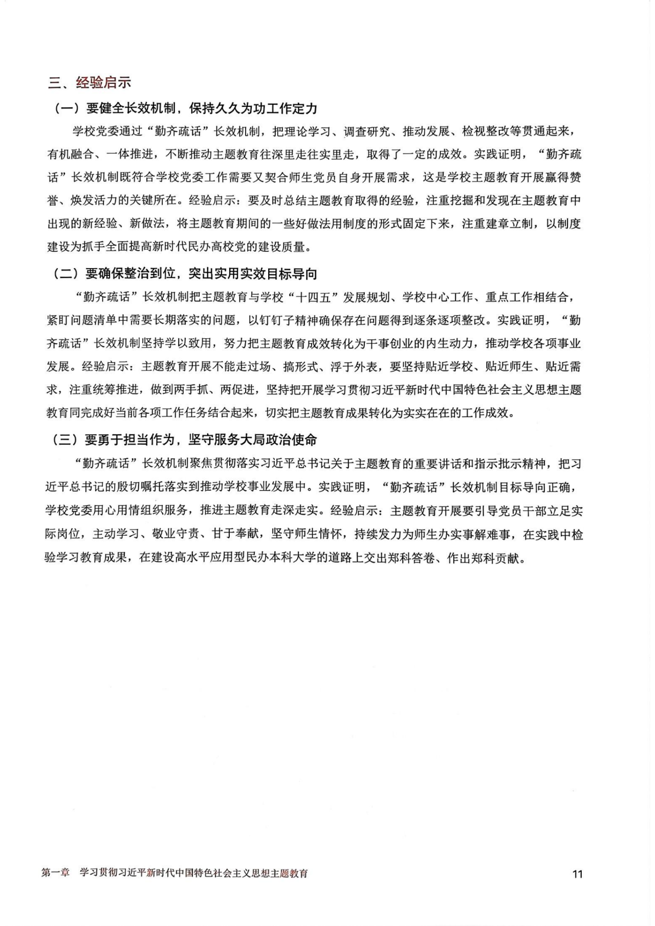 学校党委认真开展主题教育,把“学思想、强党性、重实践、建新功”作为主题教育的“纲”贯穿全过程,确保主题教育正确方向;准确把握主题教育的目标任务,努力在以学铸魂、以学增智、以学正风、以学促干方面取得实实在在的成效。将主题教育的好做法、好经验及时固定下来、长期坚持下去,以“勤齐疏话”长效机制扎实推进主题教育向纵深发展,制定“勤学习、齐标准、疏忧难、话发展”14个规定动作和具体落实时间表,拧紧压实责任,逐级传导压力,推动各项任务落实落地。各级党组织切实把思想和行动统一到学校党委决策部署上来,以实际成效凝心聚力、助推发展,促进高质量党建真正成为引领学校高质量发展的强大引擎。