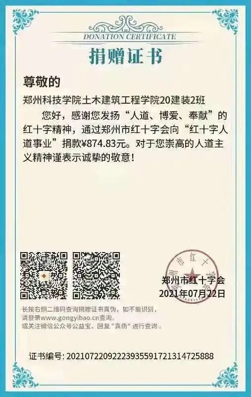 齐心协力,奉献爱心。由各个公益组织发起的募捐活动,也得到了我校学生的积极响应,他们通过不同渠道进行募捐,不论多少,只愿能够对抗洪救灾有所帮助。2021年7月21日,土木建筑工程学院20建装2班在团支书的带领下也发起了:“抗洪救灾,青年学子在行动”的募捐倡议,得到了广大同学们的积极响应,同学们自愿参加,踊跃献出自己的爱心,共计筹得善款1000元,通过红十字会机构以班级名义全部向灾区捐赠。