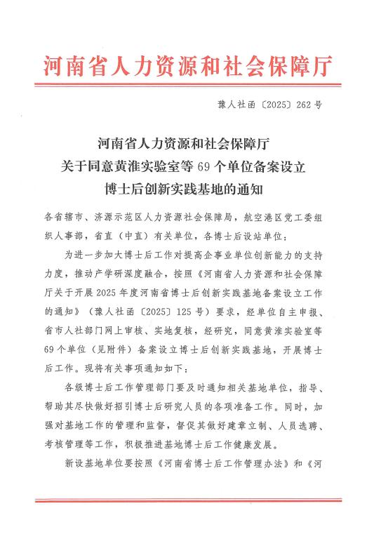 近日,河南省人力资源和社会保障厅正式下发《关于同意黄淮实验室等69个单位备案设立博士后创新实践基地的通知》(豫人社函〔2025〕262号),学校获准设立“河南省博士后创新实践基地”。该省级创新平台的获批,标志着我校在高层次人才平台建设方面取得重大突破,是学校整体办学水平与科研创新实力获得认可的重要标志。