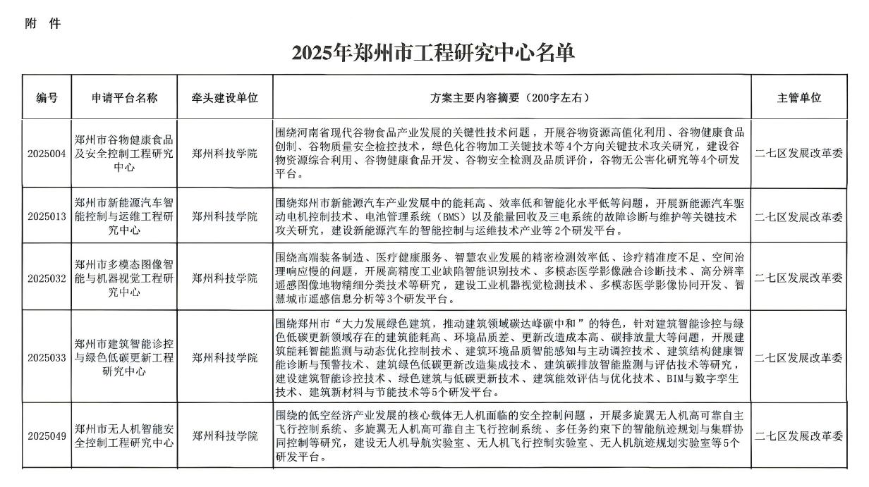 日前,《郑州市发展和改革委员会关于郑州市智能视频算法与物联网应用工程研究中心等68家市工程研究中心的批复》(郑发改高技〔2025〕338号)正式印发,由我校组织申报的“郑州市谷物健康食品及安全控制工程研究中心”、“郑州市新能源汽车智能控制与运维工程研究中心”、“郑州市多模态图像智能与机器视觉工程研究中心”、“郑州市建筑智能诊控与绿色低碳更新工程研究中心”、“郑州市无人机智能安全控制工程研究中心”等5个研究中心顺利获批组建,标志着我校在科研平台建设方面取得了新突破。