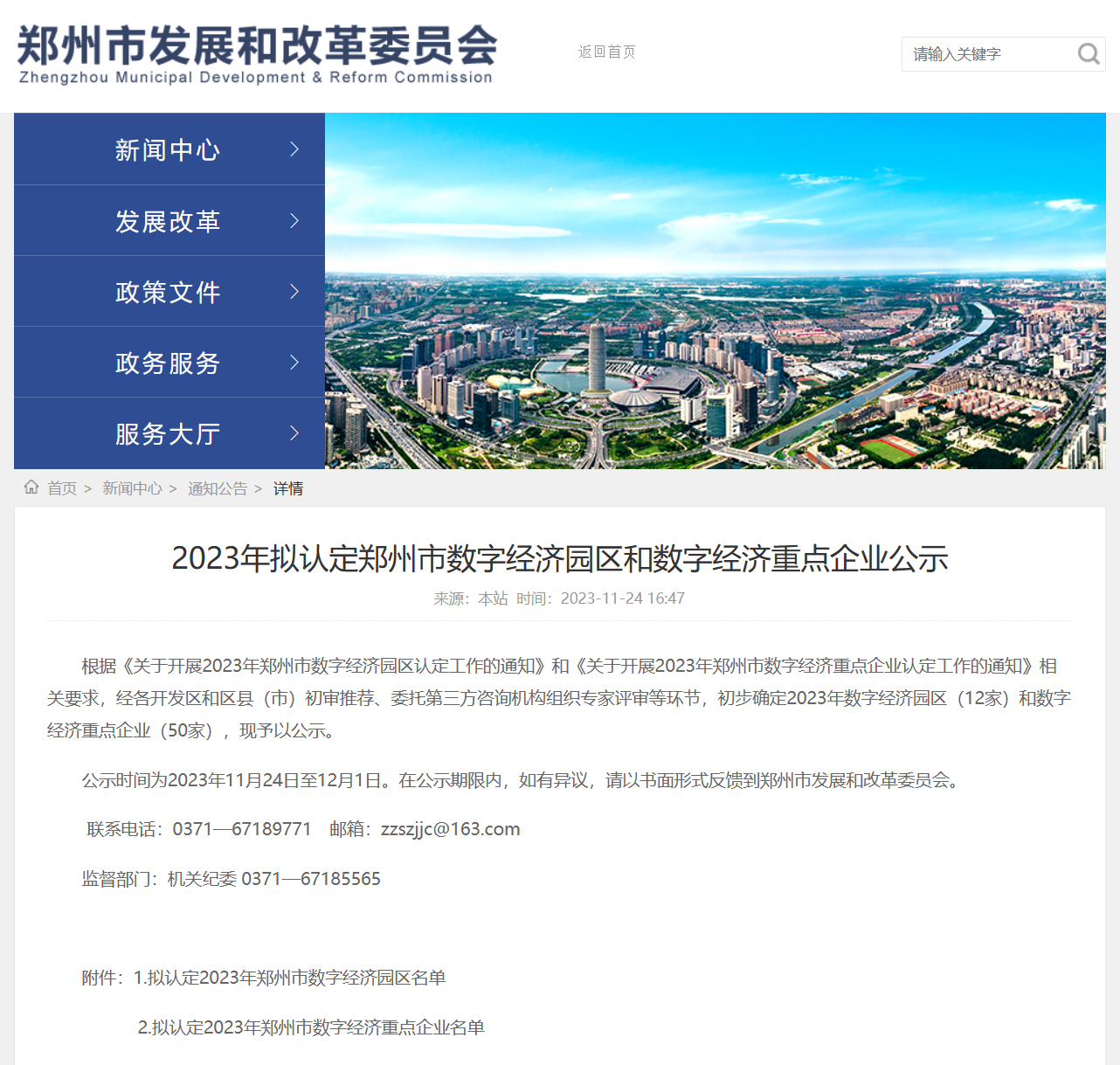 11月24日,郑州市发展和改革委员会公布了2023年拟认定郑州市数字经济园区(12家)名单,经各开发区和区县(市)初审推荐、委托第三方咨询机构组织专家评审和官网公示等环节,raybet在线官网大学生创新创业孵化园被正式认定为郑州市数字经济园区(数字产业化方向)。
