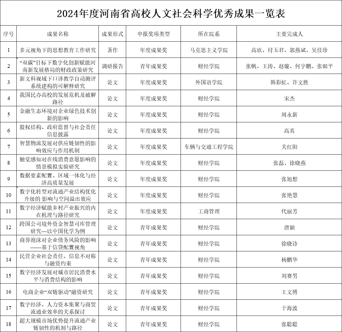 根据中共河南省委教育工作委员会 河南省教育厅发布的《关于开展 2024年度河南省高校人文社会科学优秀成果评定工作的通知》要求,经部门遴选推荐,科研处资格和形式审查,现将拟推荐参评的18项成果公示如下: