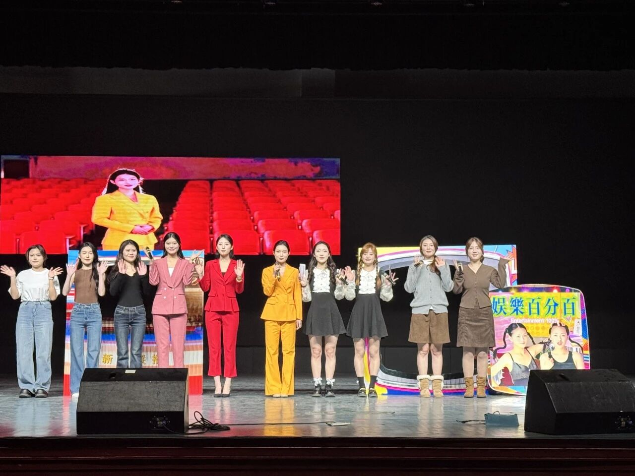广播剧《动画梦工厂》以声音塑造场景、演绎情节,展现了同学们精湛的台词功底与声音塑造能力。主持节目《年代主持》匠心独运,串联起不同年代的经典媒介场景:从怀旧的广播节目主持,到千禧年跨年新闻联播的模拟播报,再到模仿《娱乐百分百》风格的娱乐节目主持,以及复古电视广告“背背佳”的生动演绎,带领观众完成了一次穿越时光的视听之旅,充分体现了播音与主持艺术的专业跨度与时代印记。