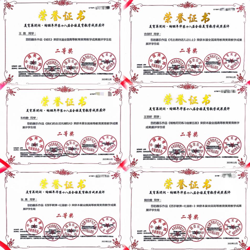 近日,在“美育再浸润·绚丽年华”第十八届全国美育教学成果展评中,音乐舞蹈学院器乐教研室戚鸣教师指导的10名学生表现亮眼,一举斩获4项一等奖、6项二等奖,以扎实的专业实力展现了器乐教研室美育教学的优异成果。值得一提的是,这10位参赛学生均是学院“艺术+思政”《钢琴》研究性教学示范课程实践音乐会的核心演出者,其赛场佳绩正是器乐教研室深耕“美育+思政”融合育人模式的生动印证。